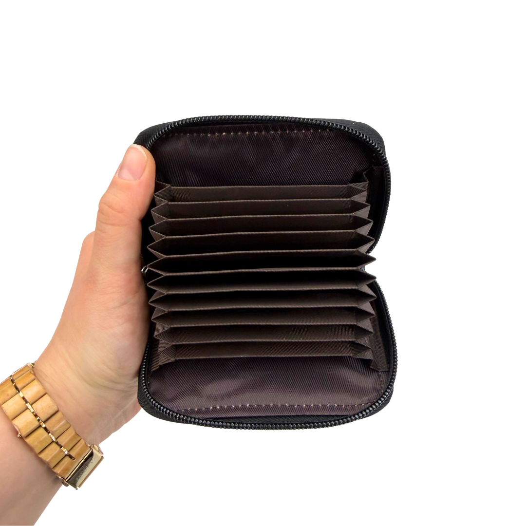 Nokian Nahkatuotteen aitonahkainen korttikotelo. 12 korttipaikkaa ja ikkunallinen korttitasku takakannessa esimerkiksi ajokortille.